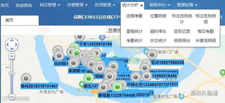 地图标注可以将与用户关注的地点进行分类标注,方便查看;同时可以将用户的终端设备与标注点相关联,在“统计分析”模块可以查看终端设备与标注点的签到相关统计。