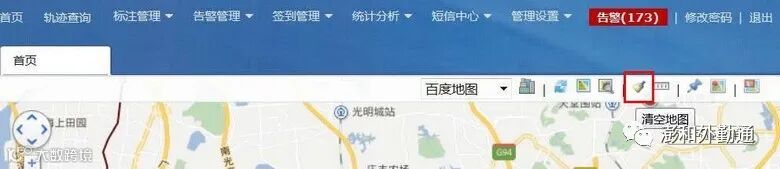 在地图上点击“清空地图”图标;可清理地图上所有的标记,如标记点、测距等标记,还原地图页面。