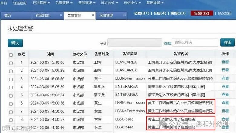 实时手机端的位置服务权限进行检测,手机未开启位置服务告警、 “澎和外勤通”客户端未开启位置服务权限,并告警提示管理员查询。