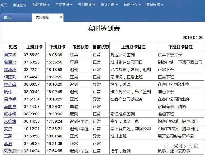 说明:“实时签到表”中的数据显示,并非显示所有人员的名单信息及自动上报的数据,仅限当日通过使用“澎和外勤通”手机客户软件,并使用“签到”功能成功上报数据后的,才会在“实时签到表”中显示数据,而当日未使用“签到”功能成功上报数据的人员的名单将不会出现在“实时签到表”中。