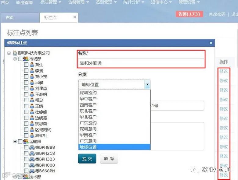 在“名称”中可修改标注点的名称,在“分类”的下拉框中,选择相应的类别,点击“提交”完成修改。也可以同时在人员列表中勾选关联人员,完成此标注点与人员的关联。