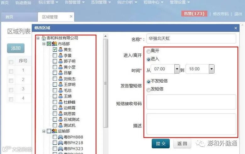 在“区域列表”中,在列表名称的右边,点击“操作”功能框中的“修改”按钮,出现修改区域页面,在左边的人员列表中勾选相关人员(单选、多选、全选均可),设置“离开”或“进入”,选择告警时间范围,“发告警短信”一栏中,选择“不发短信”,告警信息只会在平台告警提示中发出告警;选择“发短信”一项,除了平台告警提示外,还会向手机发出告警提示的短信。