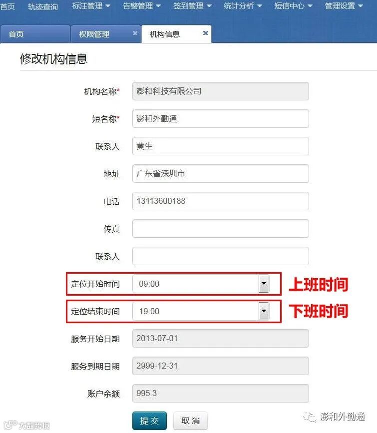 “澎和外勤通APP”已设置随手机开机自动启动,默认定位时间为每天8:00-19:00,用户可以在平台的“管理设置-机构信息”中修改此时间设置。