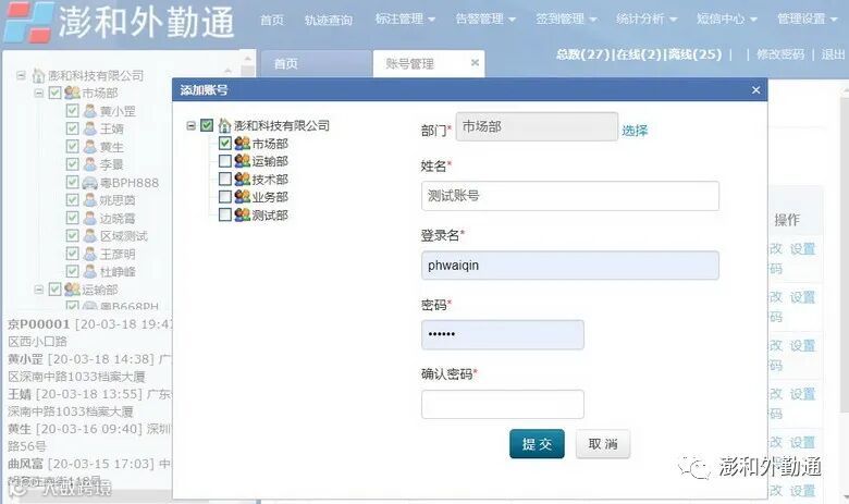 以下图为例,账号例表中,选择登录账号为phwaiqin,左边的部门例表中,勾选了“市场部”、“业务部”这两个部门,意思就是用账号phwaiqin登录后,只能查看这两个部门的人员和车辆的数据信息。