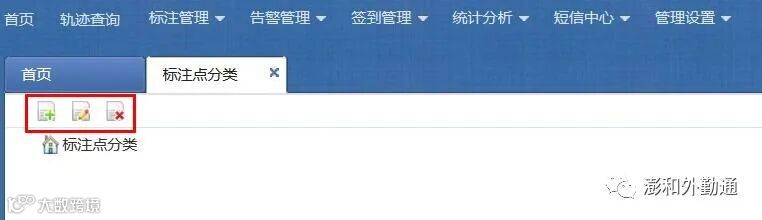 页面上方分别有“增加”、“修改”、“删除”三个功能按钮,点击“增加”按钮,设置标注点分类,同时可以对分类进行“修改”和“删除”。