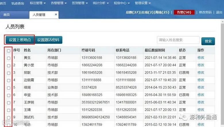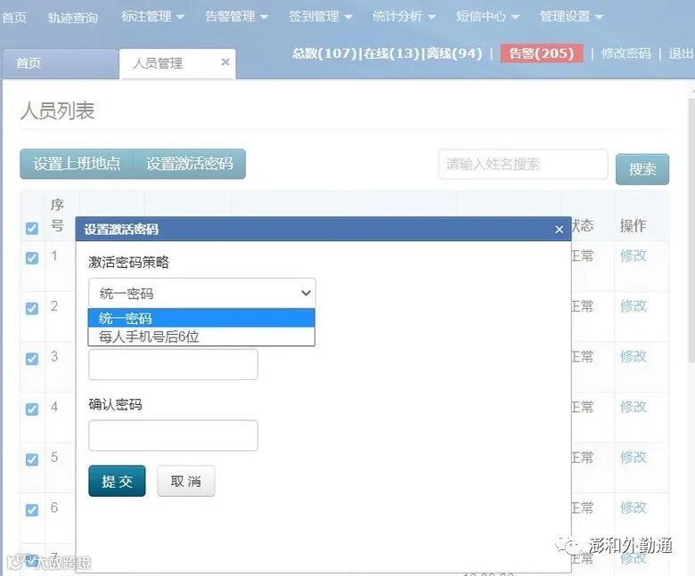 “管理设置-人员管理-设置激活密码”:选择全部人员,设置统一密码,或设置每人手机号后6位,点提交,设置成功。也可以单选每人进行单独设置,如下图: