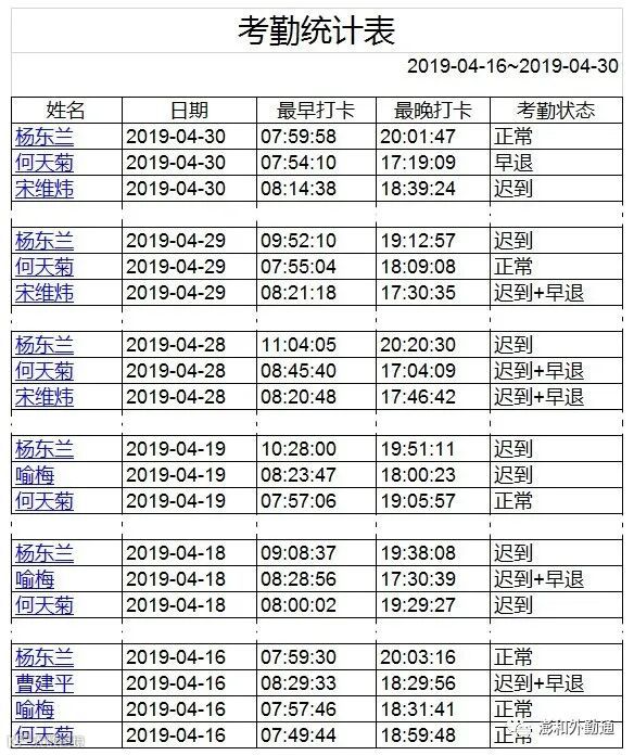 考勤统计表:将“每日考勤表”根据用户要求查询某一时间段的“每日考勤表”合成,便于下载。如下图中,查询时间为:2019年4月16日至2019年4月30日,“考勤统计表”就将这15天的“每日考勤表”合成一个表格,便于查询及下载。