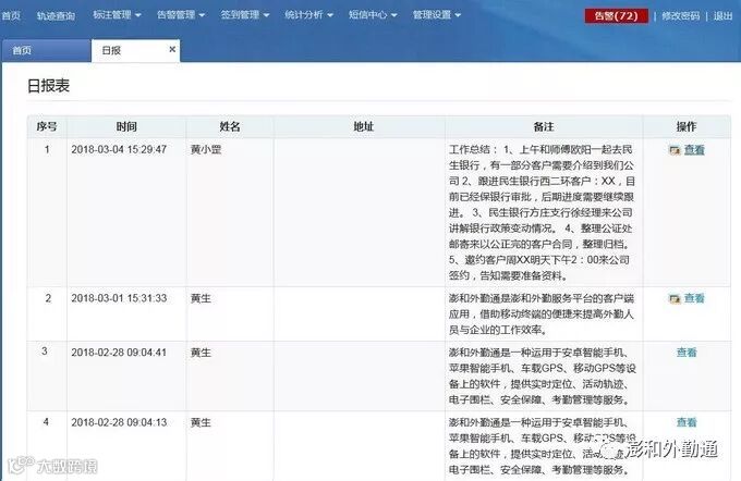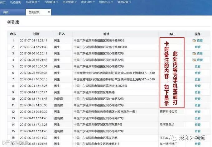 签到表:详细统计记录平台人员的全部签到打卡信息,时间、地址以及打卡人员的名字和备注信息,并可查看具体的操作记录。