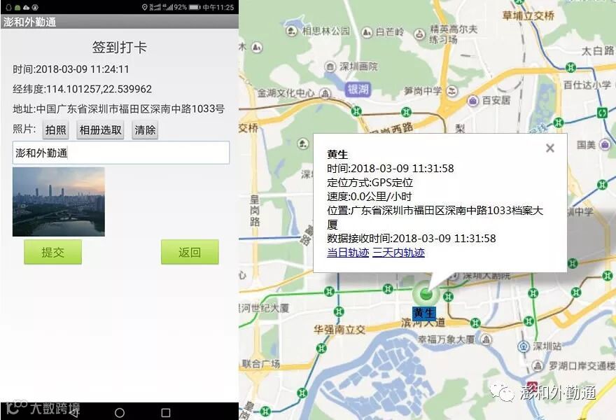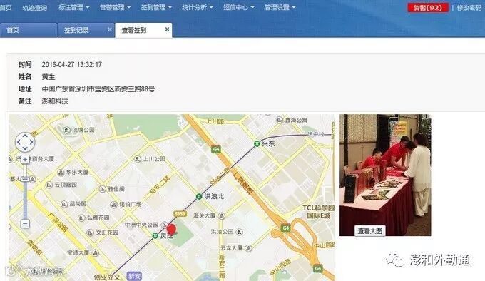 查看签到:查看详细的打卡信息,以及签到打卡点在地图上的显示地,同时可查看上传的相片,点击相片可查看大图片。