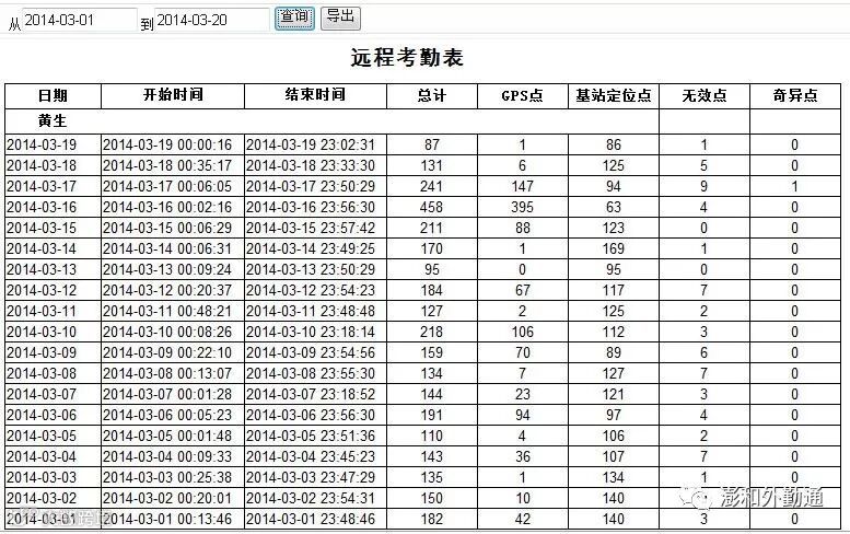 远程考勤:可以设置终端设备运行的开始和结束的时间,查看设备数据上报情况。车辆定位是24小时全天候定位模式,手机及手持设备定位,详细描述了开关机时间、程序的开启或关闭的时间。所有数据支持导出Excel表格下载保存。
