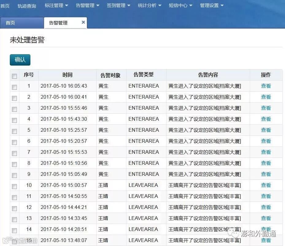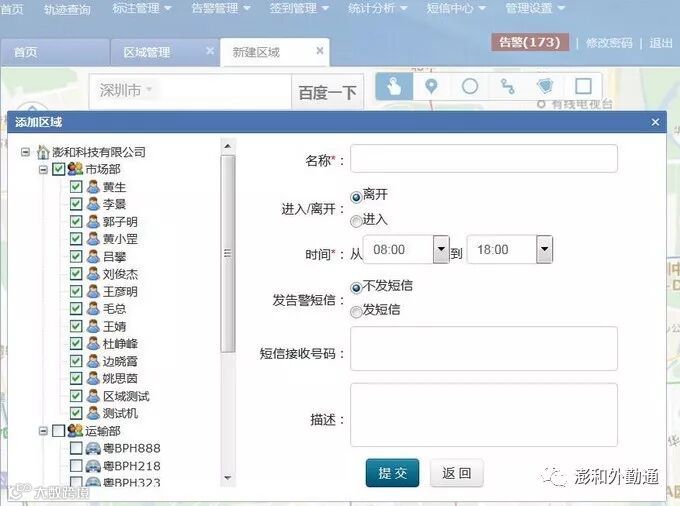 告警提示:可以设置终端设备的进入或离开的告警,同时可以设置告警提示方式,除平台告警提示外,也可以采用短信的信息提示。