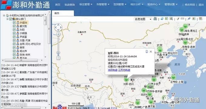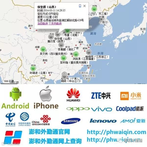通过手机安装“澎和外勤通”手机客户端软件,保持GPS开启和移动网络的开启,即可使用本系统查询手机位置及相应其他功能。