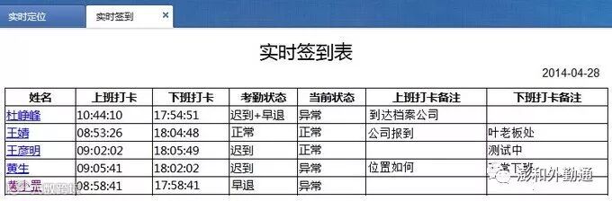 实时签到:设定人员的上班地点和上下班时间后,人员通过手机客户端软件的“签到打卡”上报数据,系统将自动生成人员的上下班考勤情况,详细描述了迟到、早退、当前实时考勤数据信息。