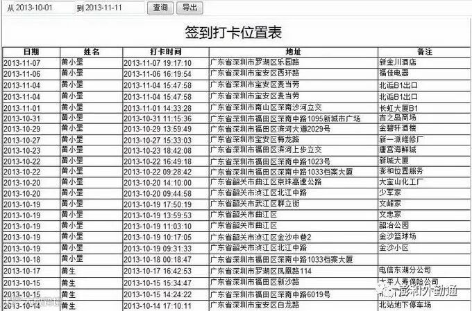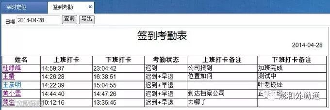 在平台的“签到打卡”功能项中,详细描述了手机终端签到打卡的详细时间、地址位置信息及上报的备注信息,有数据支持导出Excel表格下载保存。如下图:
