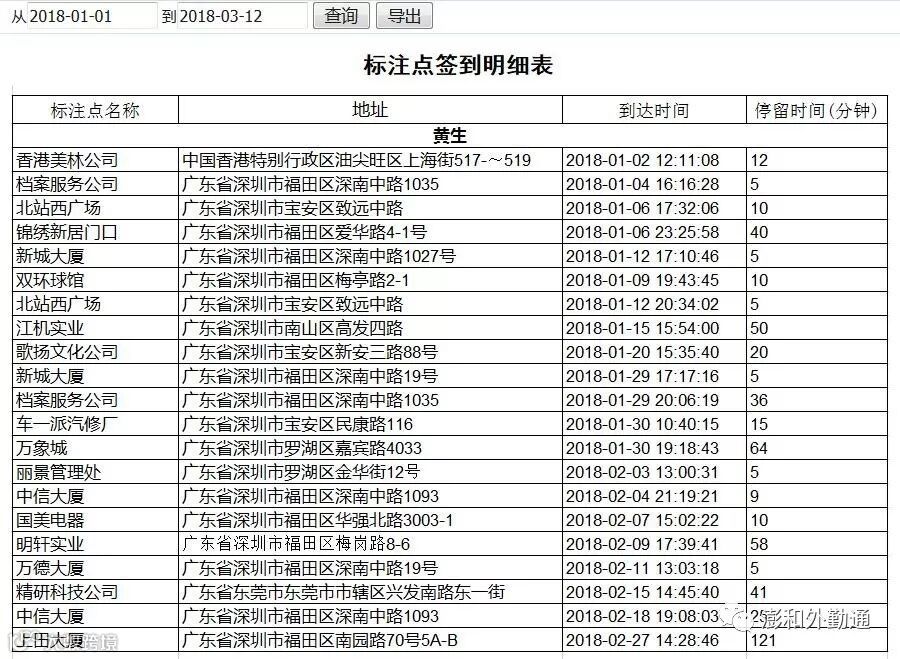 签到明细:自动生成每个终端设备的签到明细报表、详细统计终端设备到达标注点的详细时间及在标注点范围内的停留情况。所有数据支持导出Excel表格下载保存。
