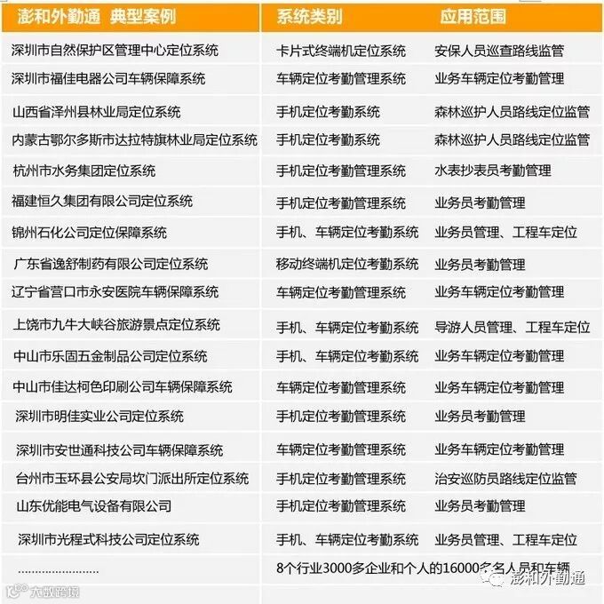 澎和外勤通,经过长时间的技术研究开发,2010年正式推出运营服务,提供一系列GPS应用系统产品。已广泛应用于金融、公安、消防、建筑、邮政、航运、货运、急救、海关缉私、公交、长途客运、出租客运、汽车租赁等行业,同时适用于社会车辆防盗反劫、安防等诸多领域,为用户创造了良好的经济效益和社会效益,深受各行业用户好评。