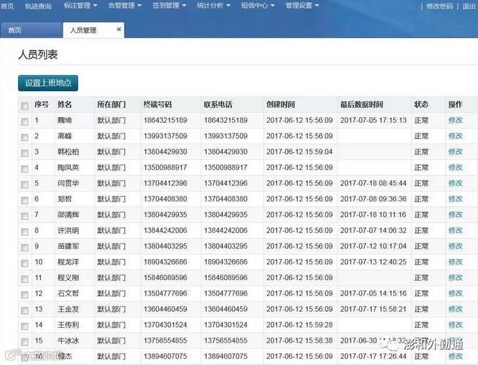 人员管理:详细记录平台中人员配置的终端设备及SIM卡号码,以及终端设备的创建时间和状态的情况,并可进行修改。可以根据人员的分布情况设置人员的相应上班地点。