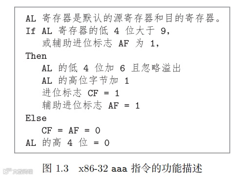 这种约定意味着 x86-32(我们用它表示 32 位地址版本的x86)的每款处理器都必须实现过去扩展的错误设计,即便它们已无意义。例如,图 1.3 列出了 x86 的 aaa(ASCII Adjustafter Addition)指令,该指令早已失去用处。