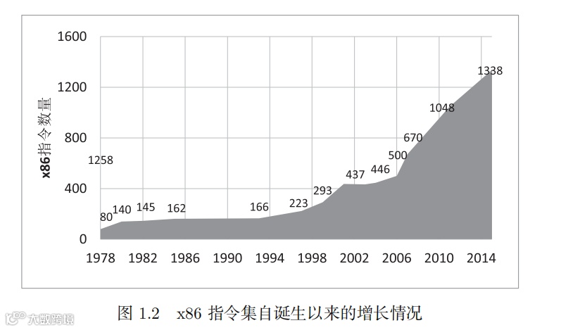 x86 在 1978 年诞生时有 80 条指令,2015 年增长到 1 338 条,翻了 16 倍,并且仍在增长。但图中数据仍偏保守。一篇 2015 年的 Intel 博客指出,统计结果为 3600条指令 (Rodgers et al. 2017)。按这个数据,在 1978 年到 2015 年期间,x86 指令平均每 4 天增长 1 条。我们统计的是汇编语言指令,他们统计的也许是机器语言指令。增长的主要原因是 x86 ISA 通过 SIMD 指令实现数据级并行。