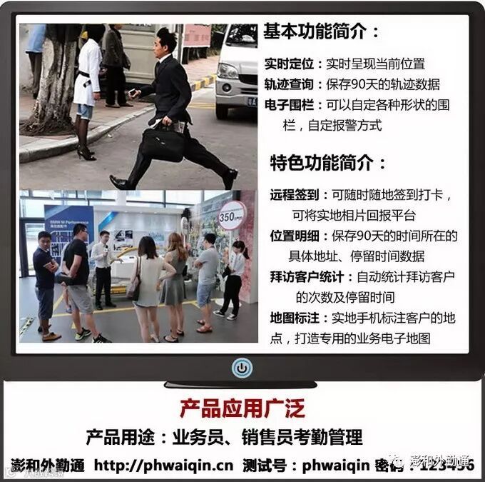 澎和外勤通是一种运用于安卓智能手机、苹果智能手机、GPS终端机等移动智能设备上的应用软件,提供针对终端设备的实时定位、活动轨迹、安全保障、考勤管理等相关服务。