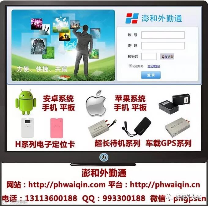 澎和外勤通平台具备强大的优势,兼容了手机定位、手持式GPS定位机、车载GPS定位机以及各种手表定位机和儿童、老人定制手机,涵盖了市面上大部分的GPS定位终端设备。并能同时在平台显示所有设备的实时定位、轨迹查询、电子围栏等待数据。