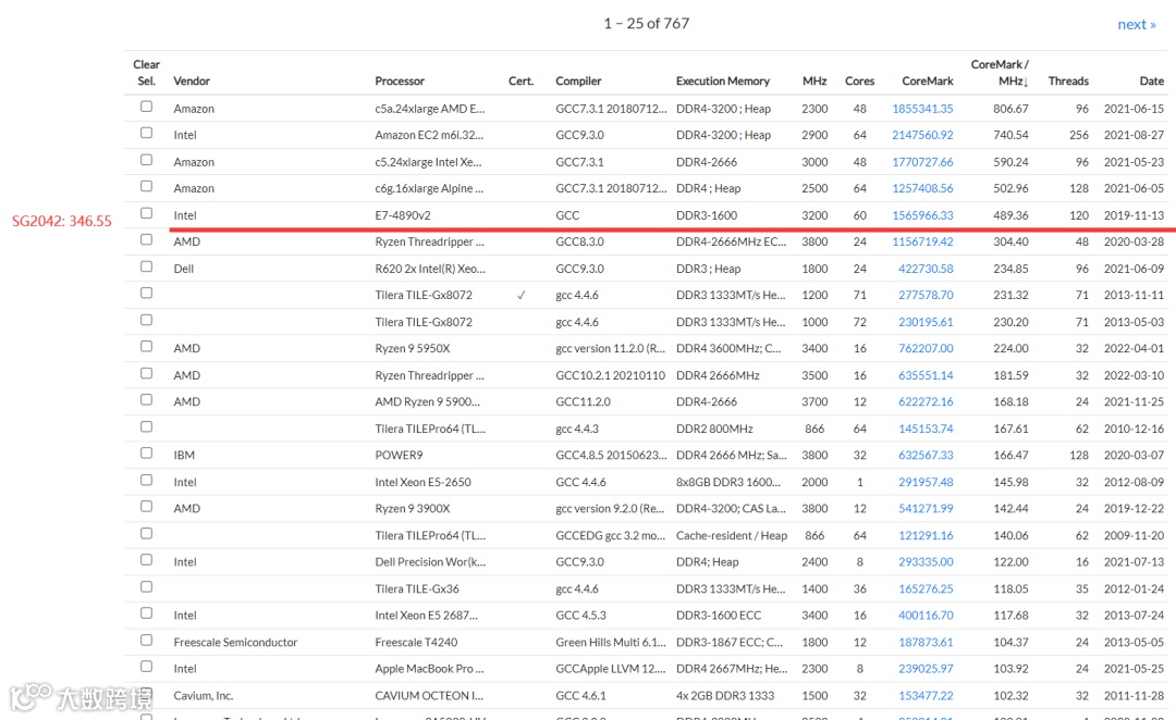 我们可以算出SG2042的 CoreMark / MHz=692303.531830/2000=346.55