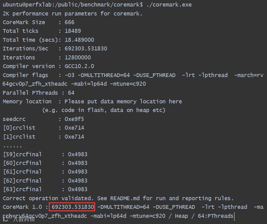 ubuntu@perfxlab:/public/benchmark/coremark$ make compile XCFLAGS="-DMULTITHREAD=64 -DUSE_PTHREAD"
