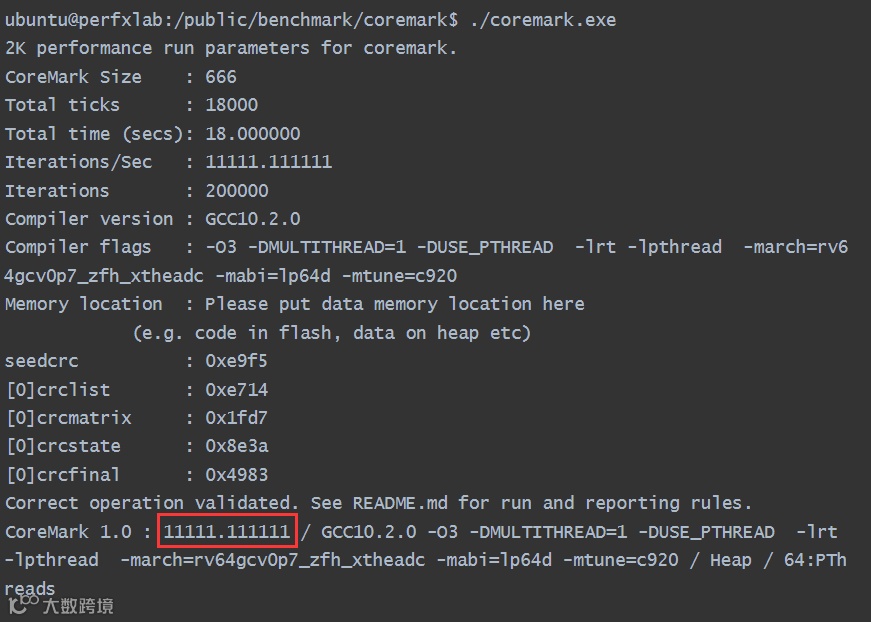 ubuntu@perfxlab:/public/benchmark/coremark$ make compile XCFLAGS="-DMULTITHREAD=1 -DUSE_PTHREAD"