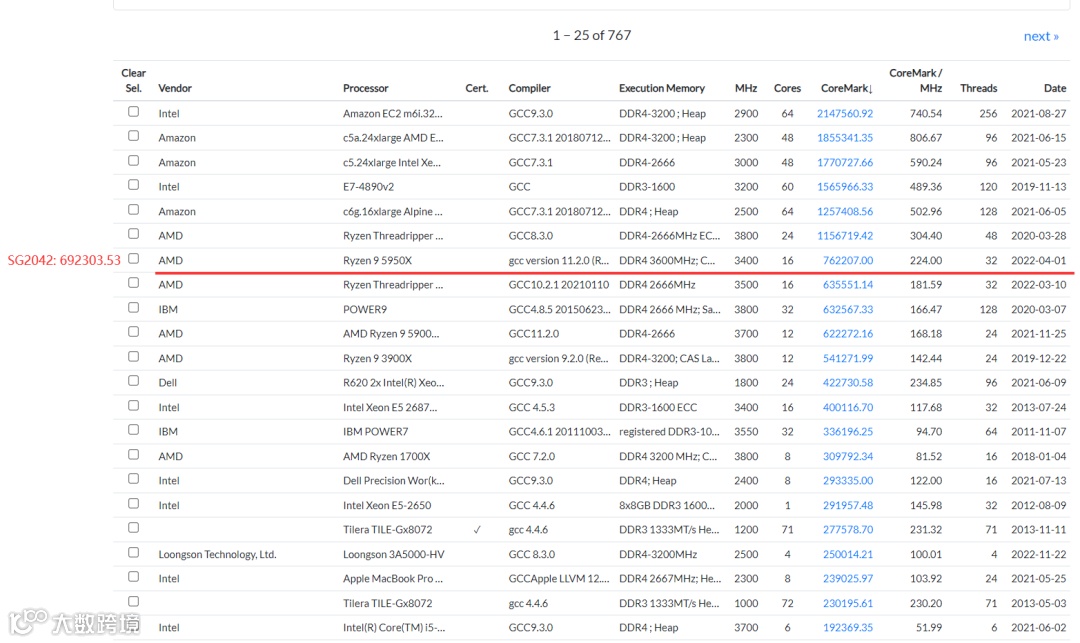 从排行榜上可以看到(上图1和图2),无论是基于 CoreMark 分数还是 CoreMark/MHz 分数,SG2042都展现出令人瞩目的表现。作为全球第一款 RISC-V 处理器芯片,它的分数已经值得充分的赞赏。尽管与第一名之间还存在一定的差距,但国产芯片将持续不断地努力,不断进步。让我们为国产芯片的未来发展加油!