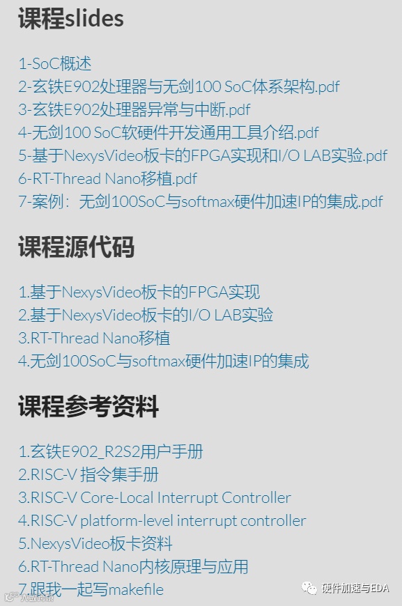 下载源代码与工程文件,配合视频进行实操。本课程官方支持的FPGA开发板为Digilent Nexy Video与澎峰科技Perf-V 开发板(Xilinx XC7A50T),但是只要FPGA板卡的资源能够承载无剑SoC,都可以用来学习与实践本课程的内容。