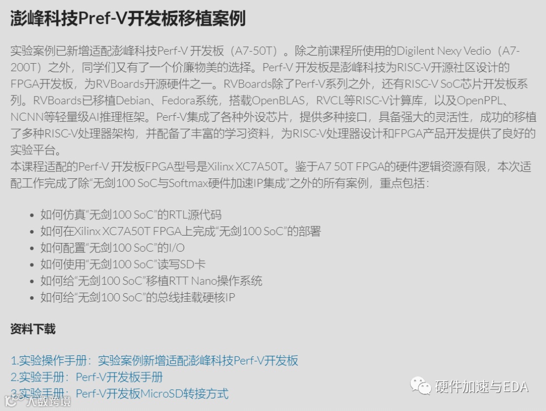 中国大学MOOC平台“芯动力-硬件加速设计方法”MOOC课程第七章“RV-SoC Design Methodology Based on T-Head E902”实验案例已新增适配澎峰科技Perf-V 开发板(A7-50T)。除之前课程所使用的Digilent Nexy Vedio(A7-200T)之外,同学们又有了一个价廉物美的选择。
