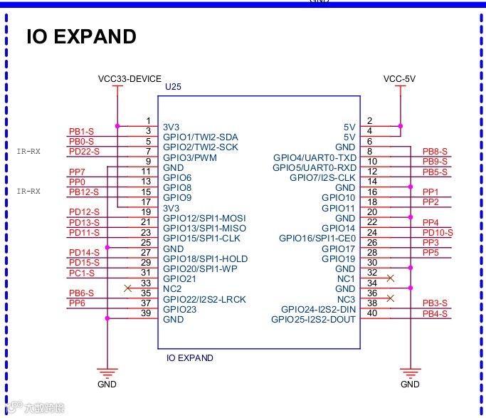 根据原理图,我们可以看到 40pin 引脚与之对应的芯片端口