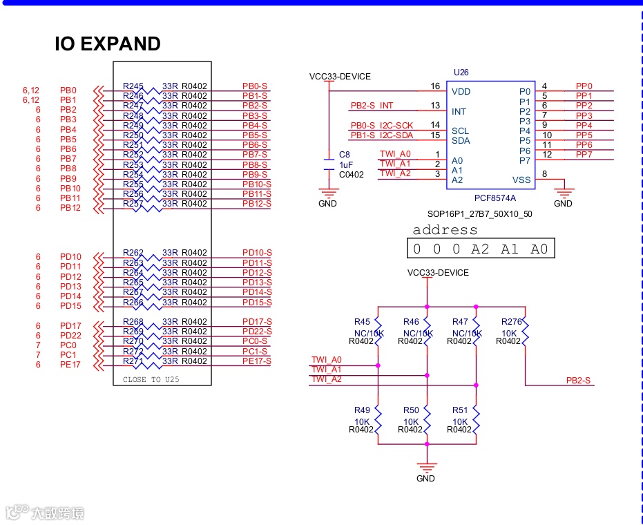 这里要说明 D1 板子用 PCF8574 扩展了 8 个 IO 分别是 PP0-PP7 ,其他引出的 IO 来至 D1 这颗芯片, 并且由于 IO 端口不足, 40 Pin 里面物理 32pin 和 38pin 为未启用(NC), 树莓派中是两个 GPIO 端口