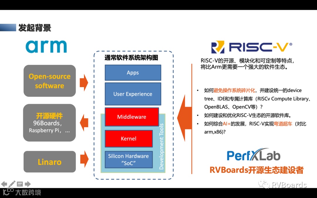 我介绍了张先轶博士这边启动的RVBoards开源硬件项目,RVBoards是依托于具体化的开源硬件,致力于RISC-V的基础软件技术,工具链等的研究工作,最终目的是服务于开发者,尤其是让应用层开发人员能平滑甚至于无感从ARM切换到RISC-V,也由此使得海量的开源软件可以被RISC-V生态所顺利使用。RVBoards近期计划是,基于RISC-V ip产学研层面推出Perf-V系列,在RISC-V soc层面将推出Perf-A,Perf-B系列开源硬件。