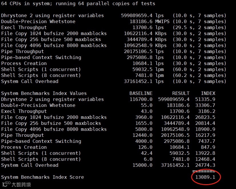 根据所提供的UnixBench基准测试结果,在多核情况下进行了系统性能测试。多核测试中,使用了所有64个CPU核心进行并行测试。