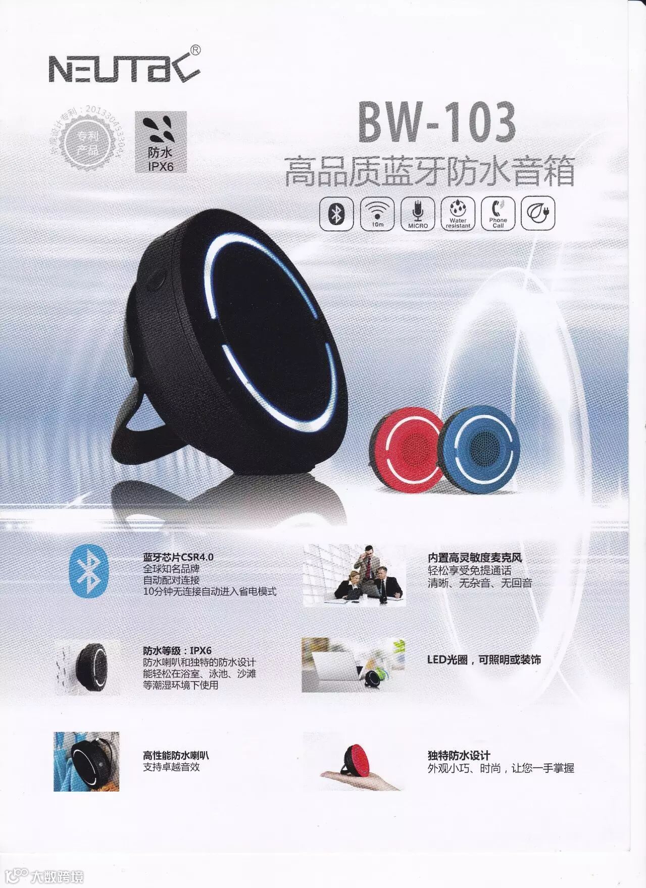 Neutac BW-103 蓝牙CSR4.0 6级防水无线蓝牙音箱带LED灯 超炫重低音 立体声 可接听电话 方便携带 精美小巧 可挂在浴室、海边等潮湿环境下使用 适合所有带蓝牙功能的手机、平板电脑 中国实用新型专利产品!