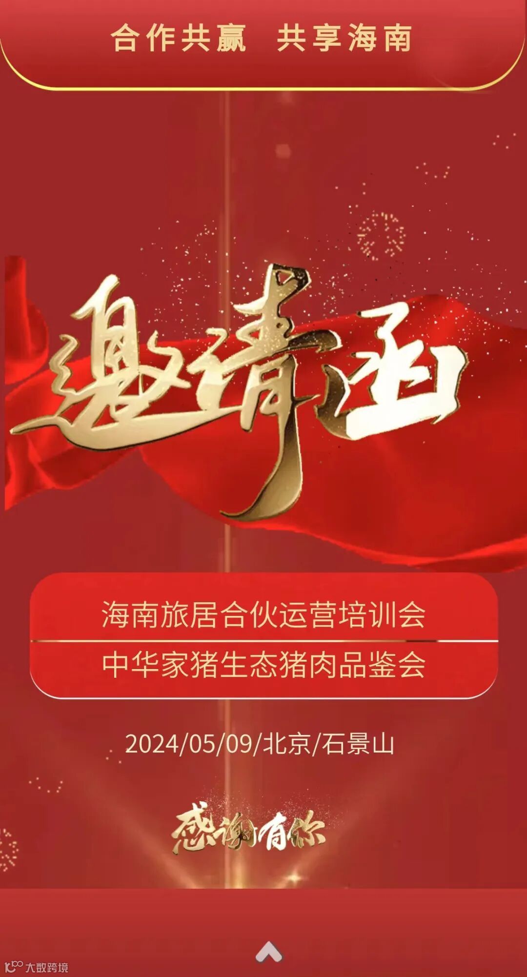 非常感谢您对海南旅居--数字化租赁的大力支持和关心,为让您更好的了解我们,更好的使我们合作共赢、共创辉煌,经海南富新海文旅置业集团和北京旺城泰合农业科技公司共同协商,决定于2024年5月9日,在北京石景山北京兴盛恒泰投资管理公司办公大楼主楼一楼会议室举办《第一届海南旅居赋能中华家猪养殖城市合伙运营培训会》和《首届中华家猪生态猪肉品鉴会》, 会期一天 ,会上,将作重大政策发布和专业运营指导,如:前50名城市合伙运营商,每家送158万元,扶持快速落地运营。