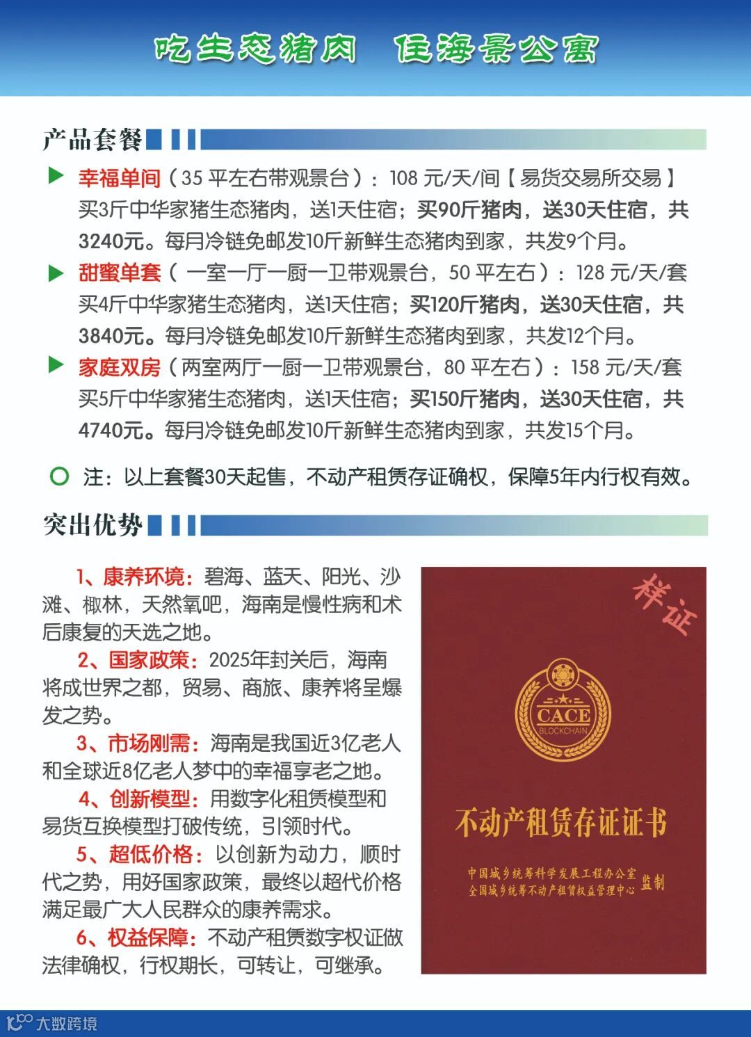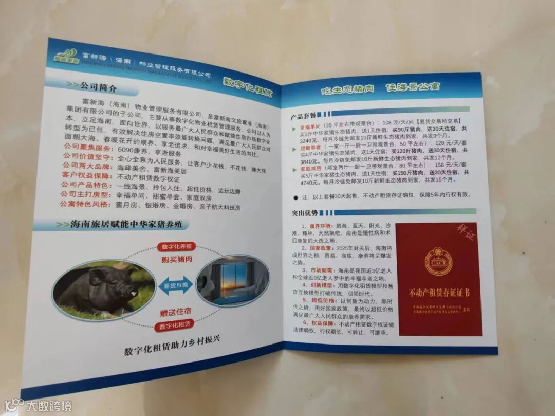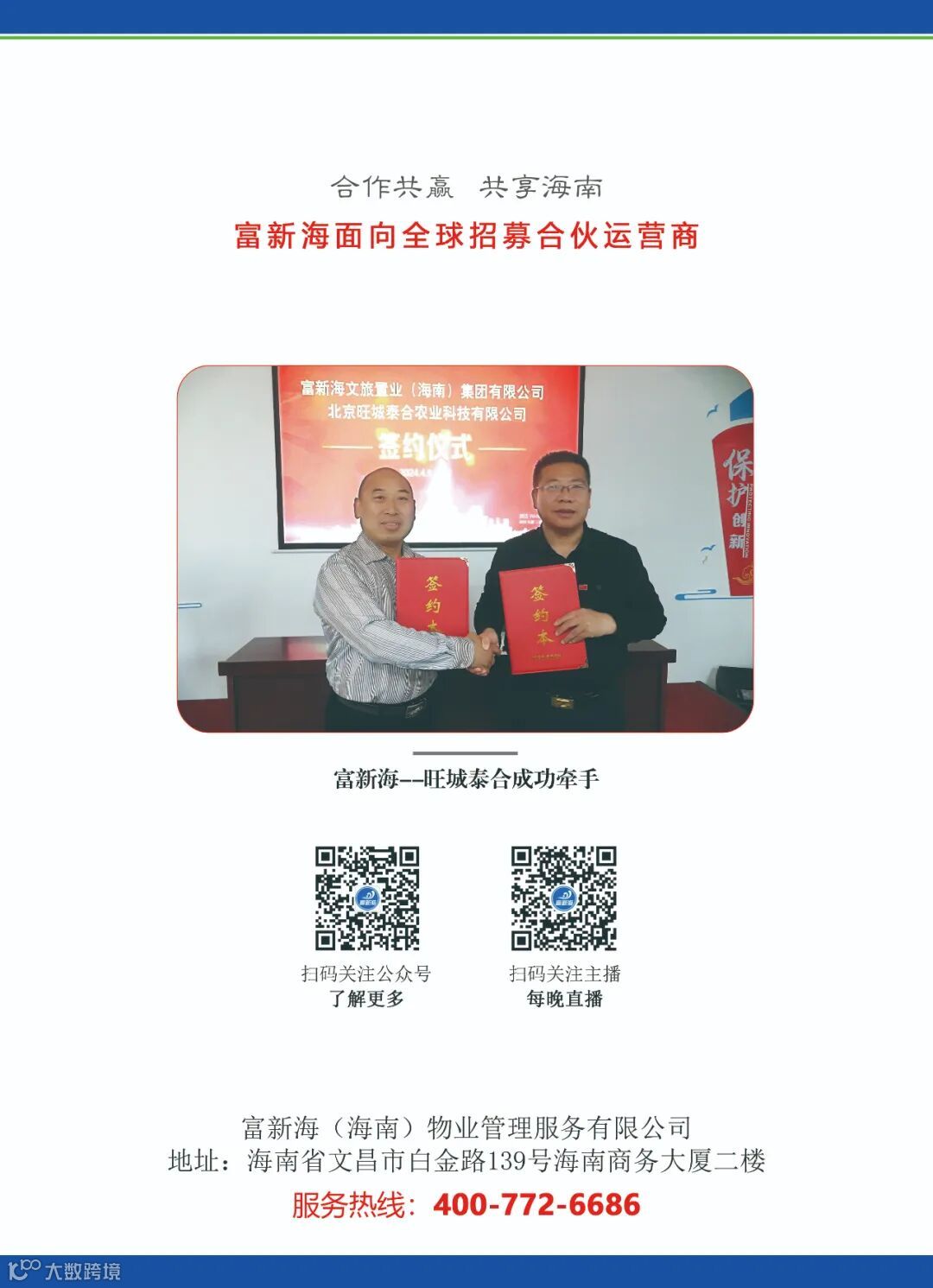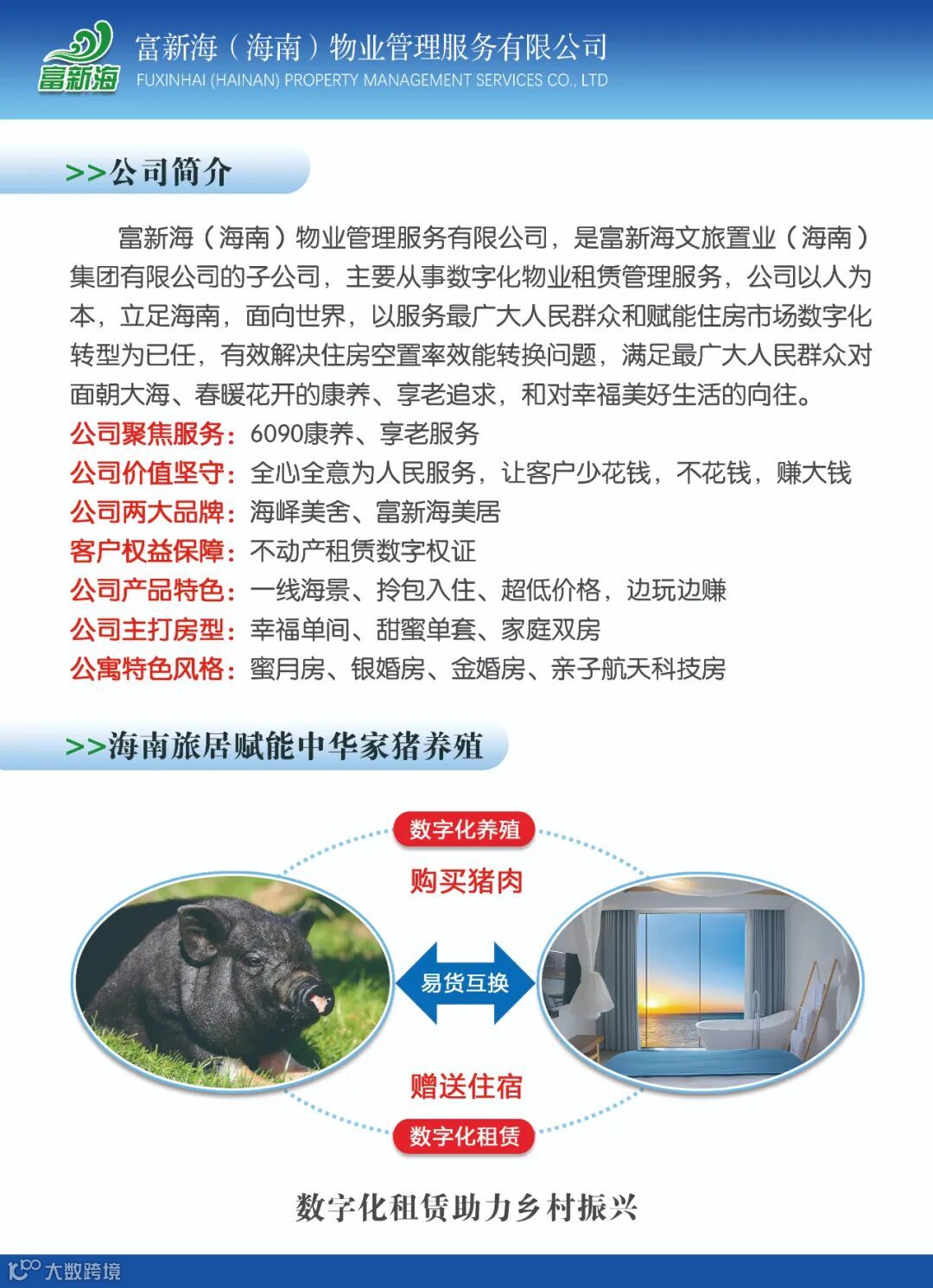 富新海文旅置业(海南)集团有限公司计划首年推出数千套海南旅游度假海景房住宿,为中华家猪产业提供超 2 亿元产值助力家猪生态养殖产业。同时,通过海南旅居赋能中华家猪,让更多的普通百姓通过这种商业模式,可以低成本地实现海南康养旅居的梦想,也可以为更多的 6090 老龄群体助力提供舒适的养老度假体验。在此基础上,通过系统运营方式,让广大养殖农户享受中华家猪产业发展的红利,实现乡村振兴共同富裕的发展目标。