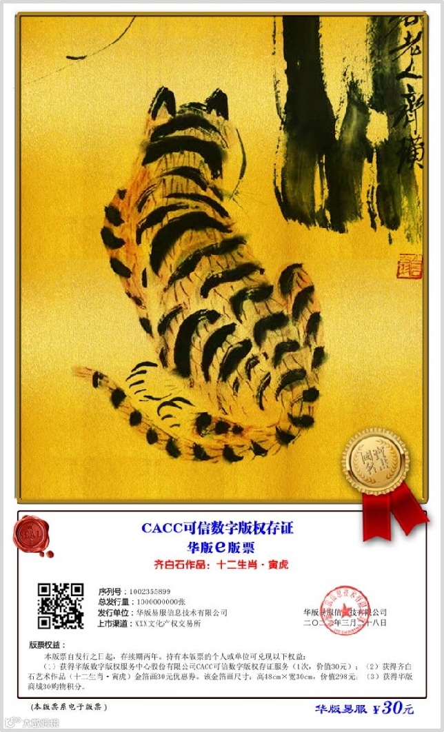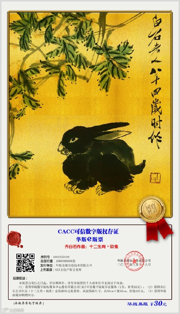 3、致力于CACC版票交易服务,在全国发行“华版e版票”,将数字版权应用场景与文化艺术品的金融交易相融合,在文化产权交易平台交易。