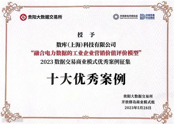值得一提的是,在此次数博会期间举办的中国数据首席地推官40人论坛中,数库科技与南方电网贵州电网公司产出的这一创新成果还被授予了“2023数据交易商业模式十大优秀案例”的殊荣: