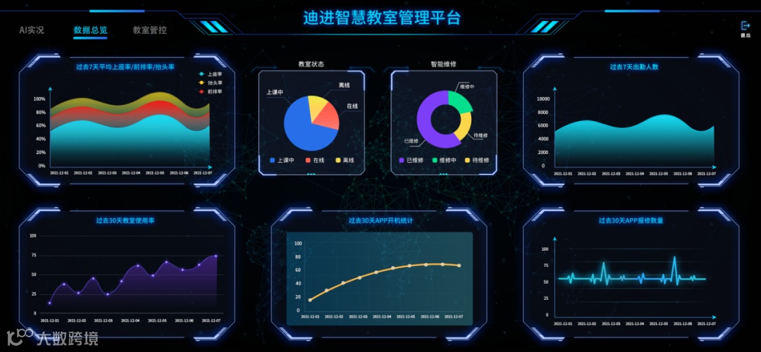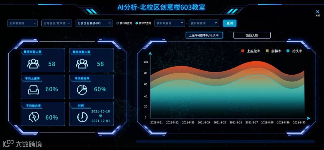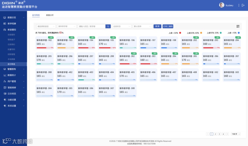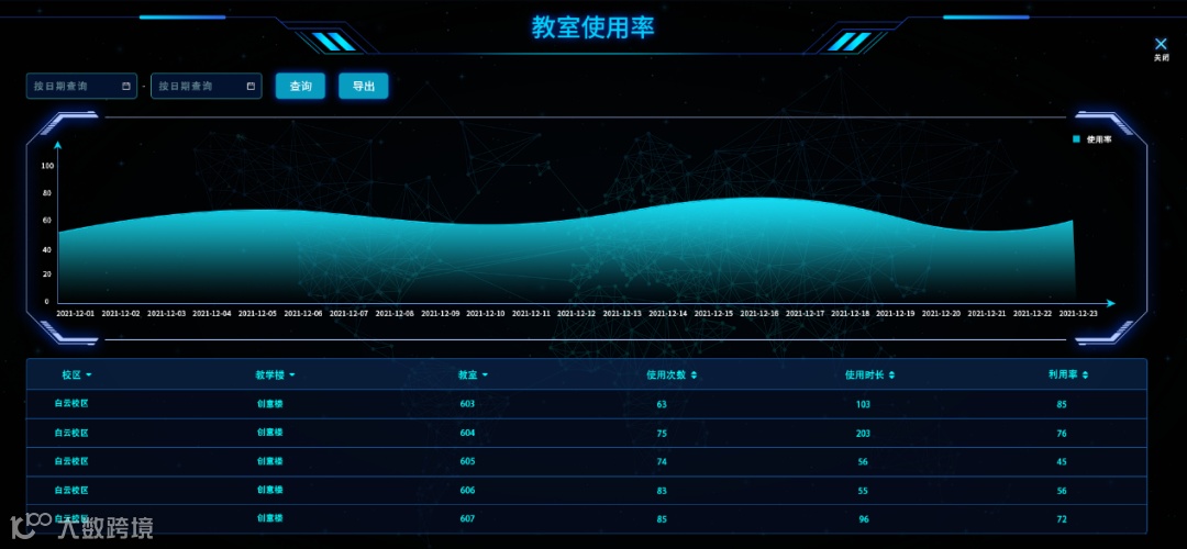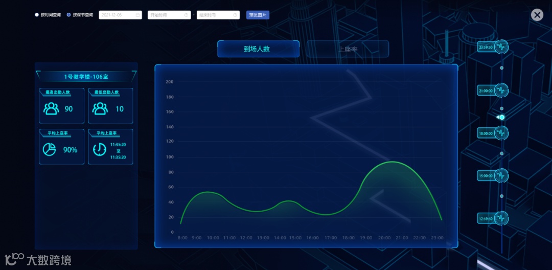 同时通过大屏看板,化繁为简,清楚明了当前各个教学楼的教室人员情况、教室使用率等实时数据。