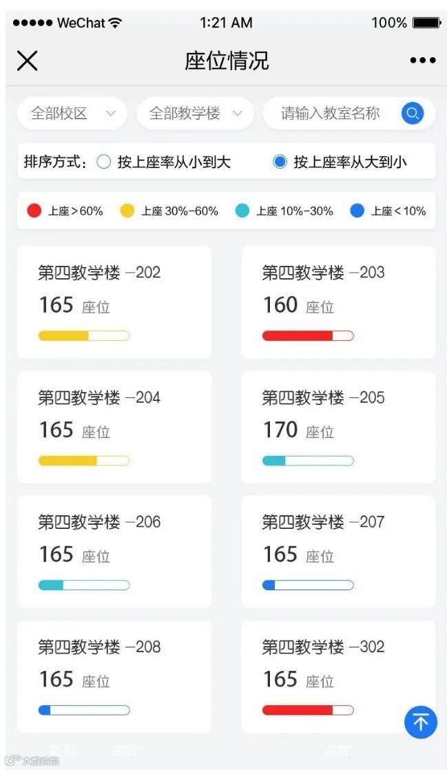 并统计出不同时间段的上座率,科学管理自习室的使用,指引学生在高峰期时,灵活分阶段开放自习室,避免资源的浪费。