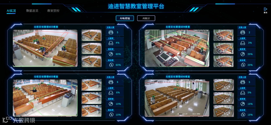 迪进AI物联智慧教室与众不同,基于深度学习算法的视频监测技术,具备AI功能的区域预分区现场人员分布状态识别能力,新推出自习室导流功能,配合数据大屏看板,科学管理校内资源。