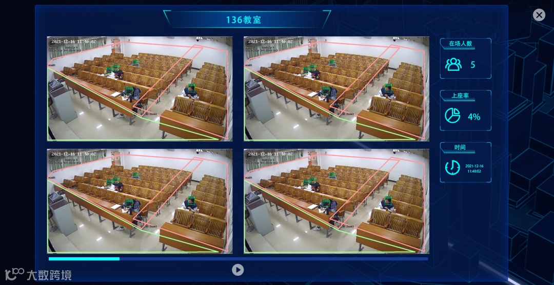 利用教室原有网络摄像头接入AI功能,对教室监控画面进行视觉分析算法,可自定义划分区域,检测现场人员分布,统计出人员数量,AI智能算法设定每5秒更新教室情况,让在校人员从此不再为自习室问题而烦恼。
