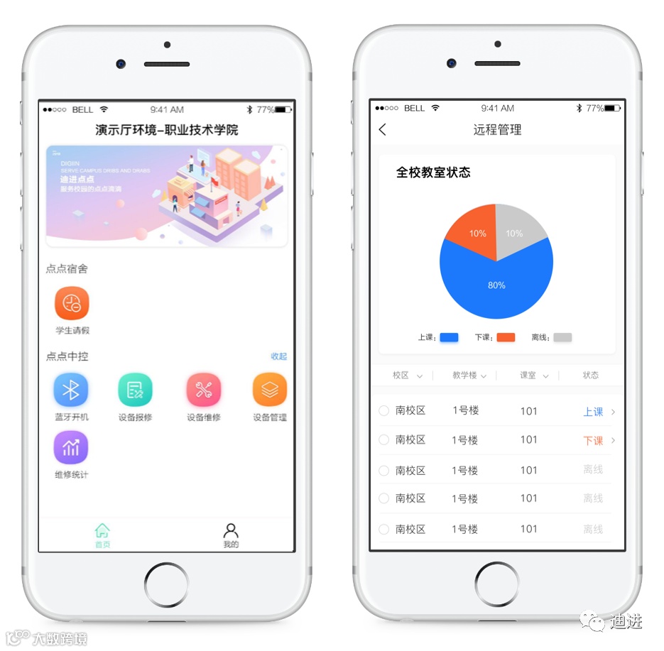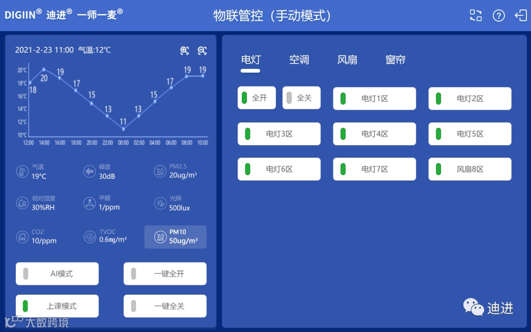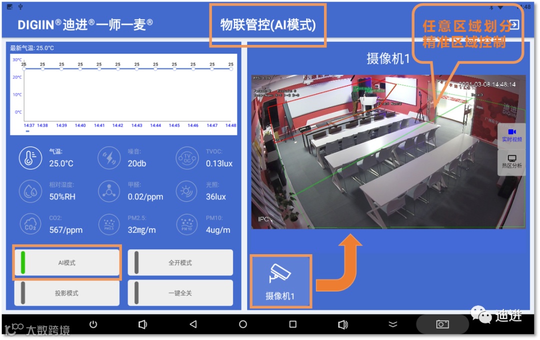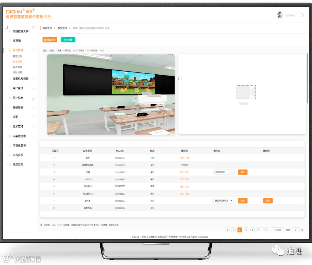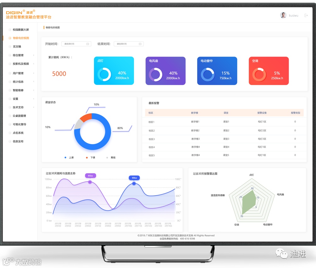 迪进AI场景是一种崭新的智慧教室管控模式,极大降低管理人员、使用人员的劳动强度,把智慧教室物联管控建设水平提升到一个崭新的高度。