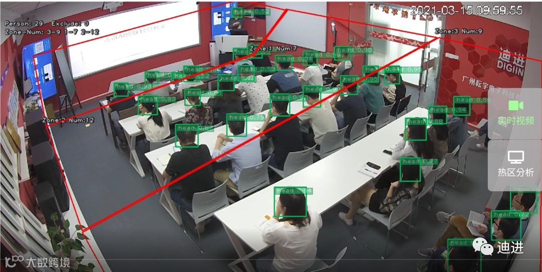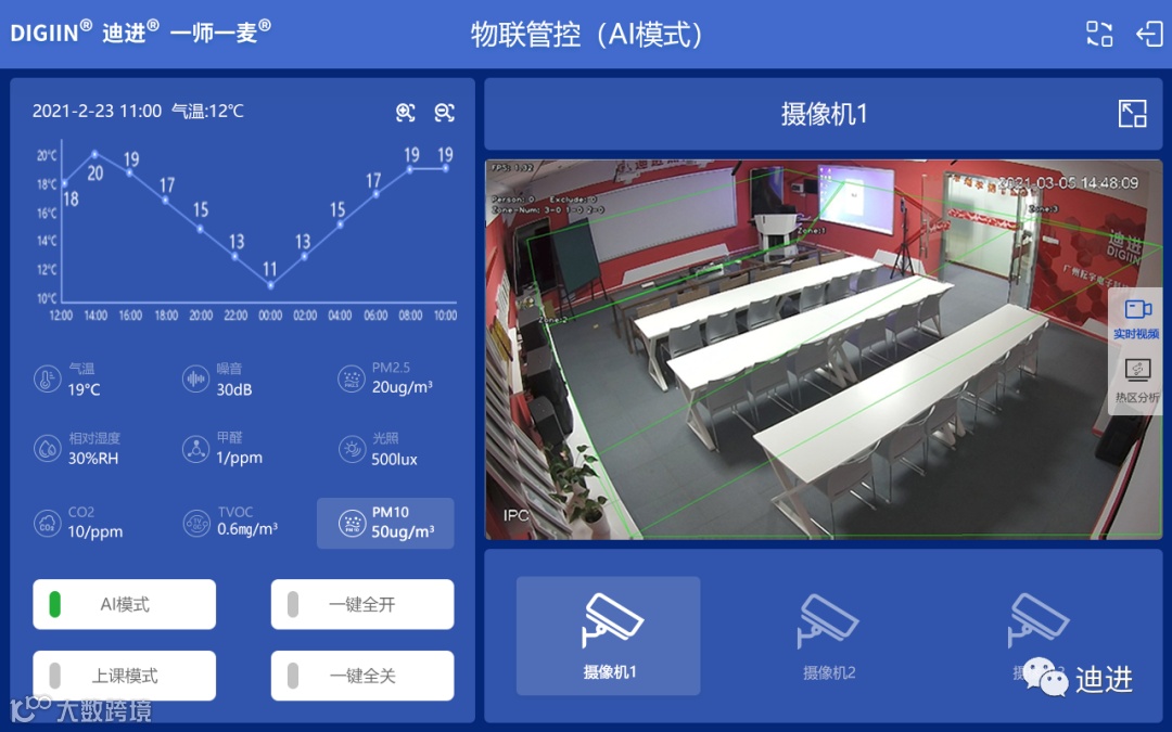 迪进AI物联智慧教室,采用了迪进AI盒子,以物联网、云计算、大数据分析及人工智能等技术为核心,通过网络摄像头,读取网络视频流,对教室监控画面进行视觉分析算法,对视频流的帧进行人员检测,并分析结果送到液晶触控屏进行设备联动与视频实时监控,提供全面感知、智慧型、协作型的一体化智慧教学管理。