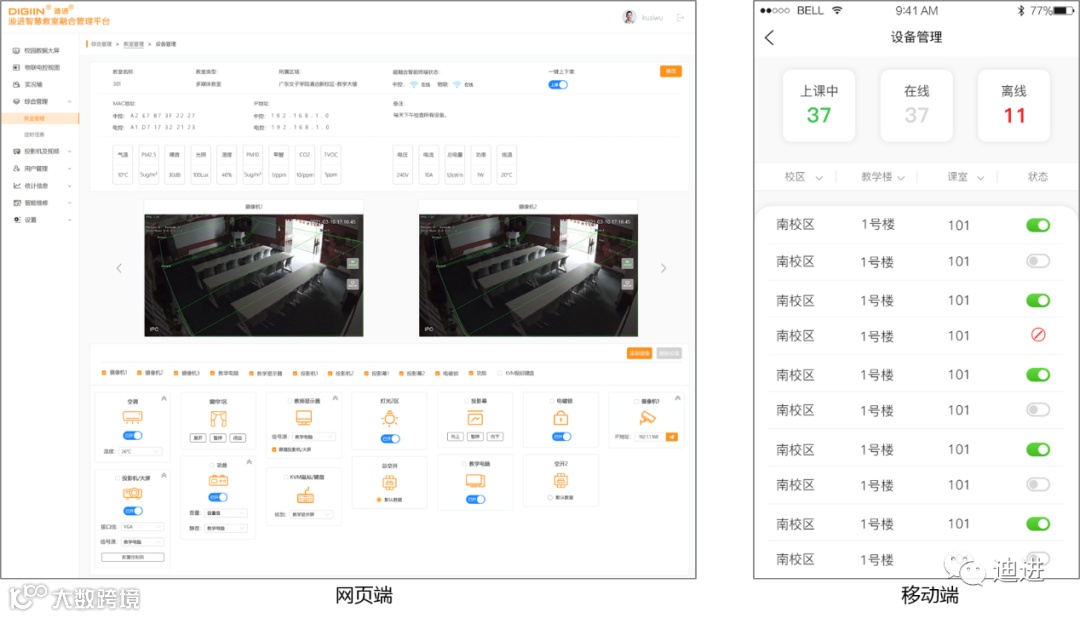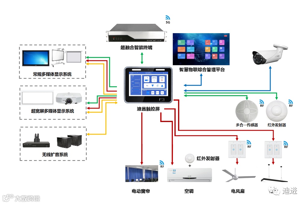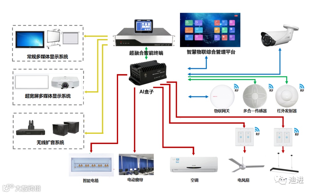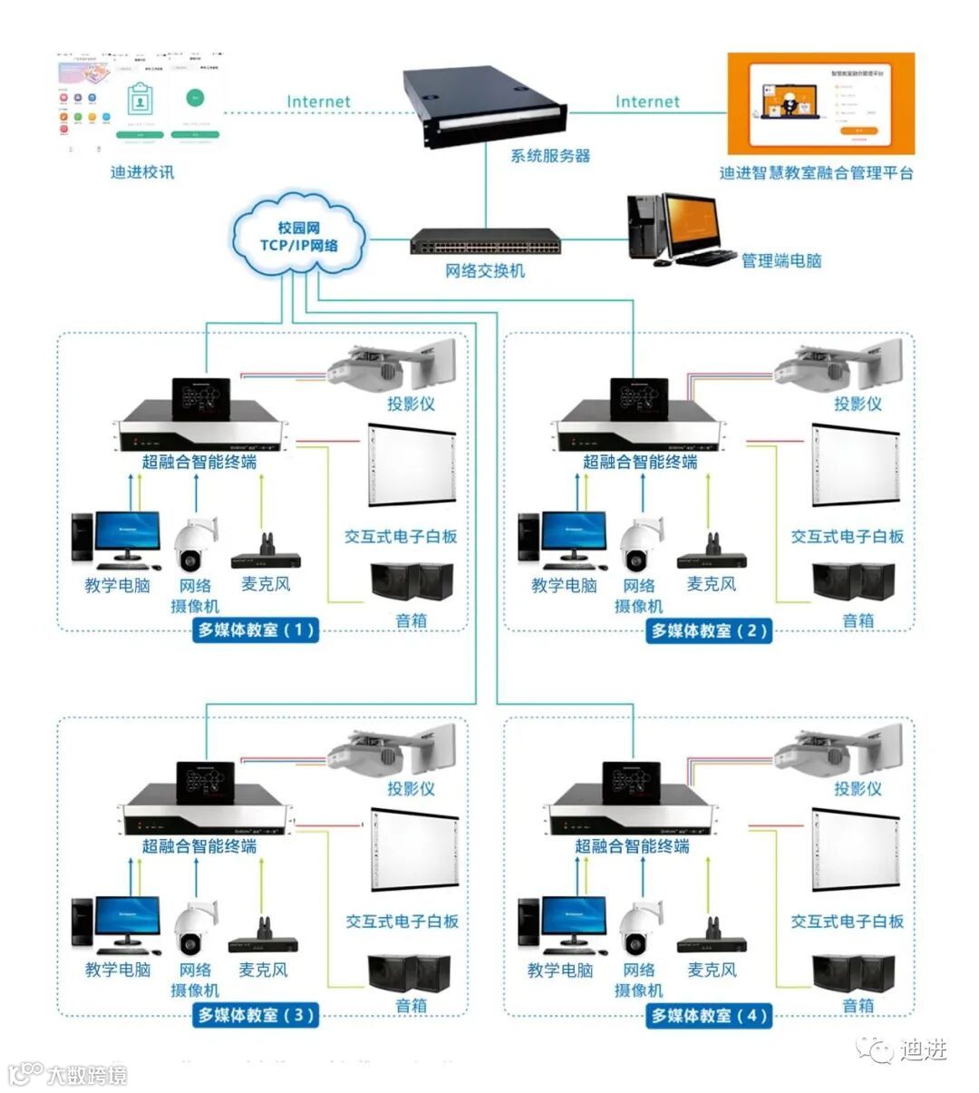 迪进智慧教室解决方案以超融合智能终端为核心,采用大数据、物联网、云计算及人工智能技术,构建实现以智能管理为目的的统一管控,为教师教学、管理员运维、校领导决策提供客观数据参考。