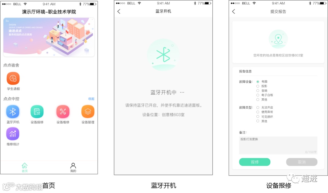 教师可通过蓝牙开机的方式开启对应教室的超融合智能终端以及对应设备,在发现教室内设备出现故障时使用智能报修功能将报修信息提交给对应的维修人员。