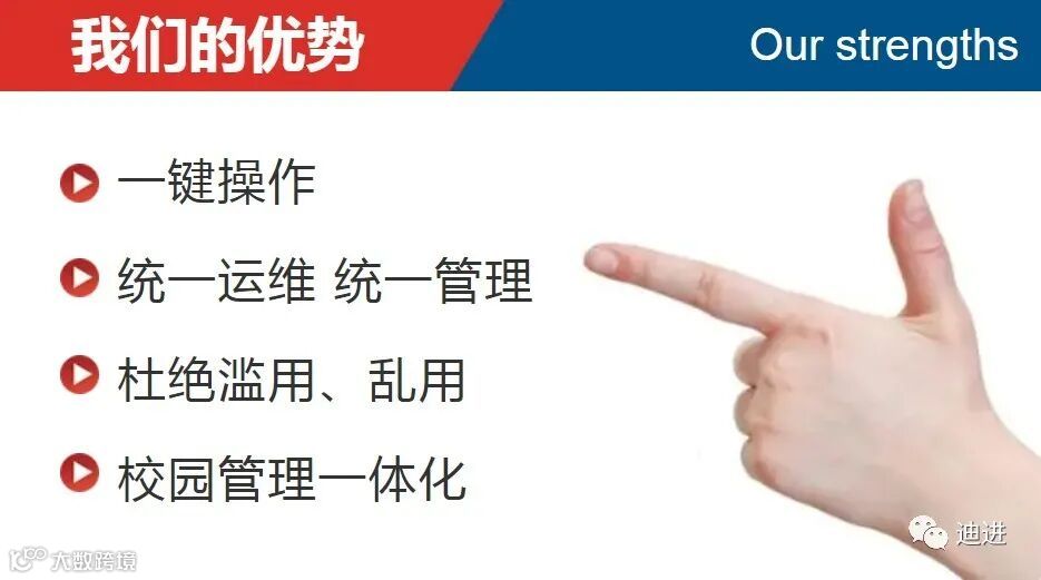 迪进超融合智慧教室整体解决方案在传统教室的基础上进行革命性的升级,运用现代化手段切入整个教学过程,让课堂变得简单、高效、智能。