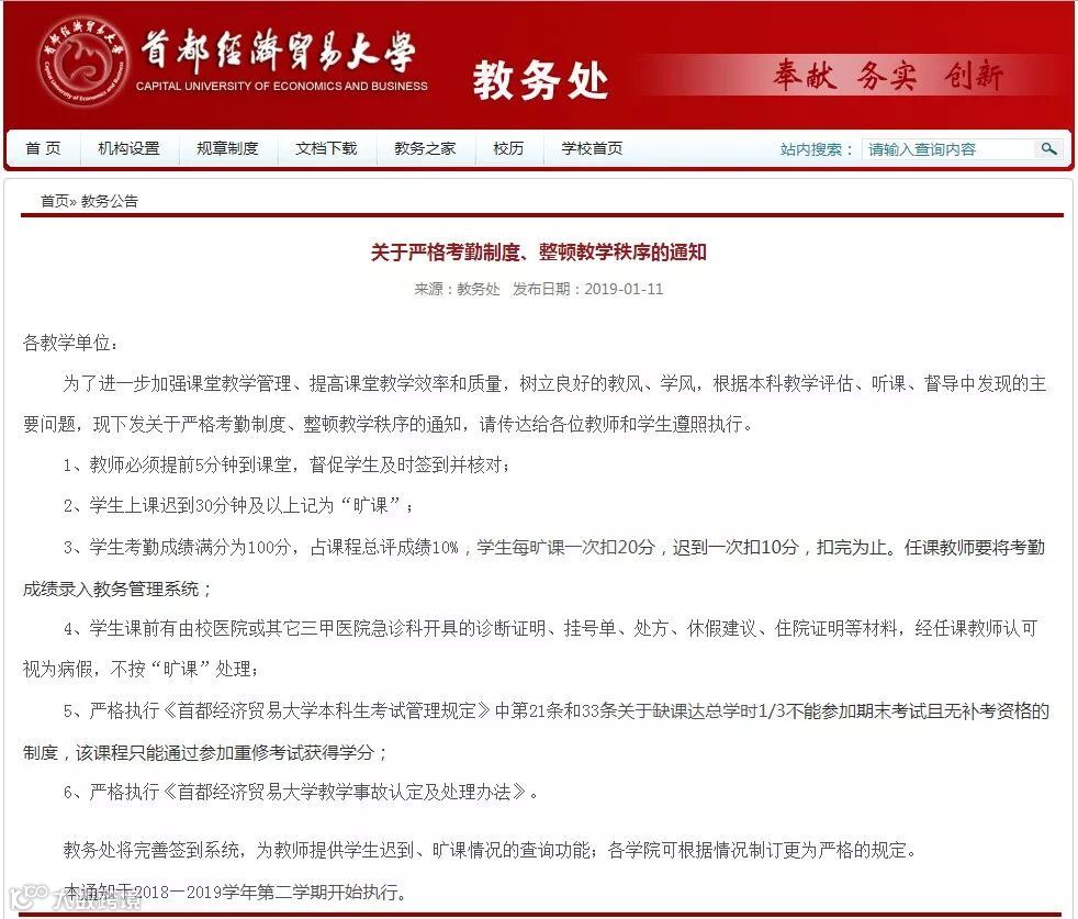 早在1月11日,首都经济贸易大学教务处就发出通知,旨在加强课堂教学管理、提高课堂教学效率和质量,树立良好的教风学风。通知强调“教师必须提前5分钟到课堂,督促学生及时签到并核对,学生上课迟到30分钟及以上记为‘旷课’,任课教师要将考勤成绩录入教务管理系统”。教务处同时表示,将完善签到系统,为教师提供学生迟到、旷课情况的查询功能。
